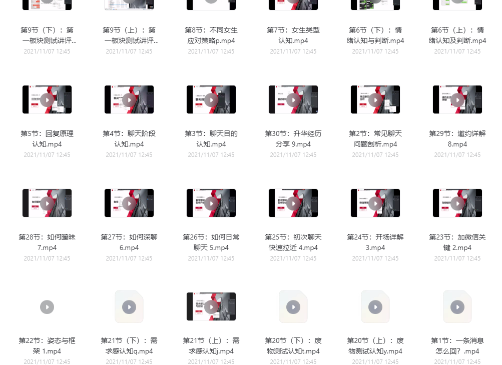 从一个三句话聊死的直男,变成一个会幽默,会调情,有态度,有想法的情感导师。一套市面最系统专门讲聊天的课,一共有60多个小时,用心程度可见一斑。最强聊天课程。