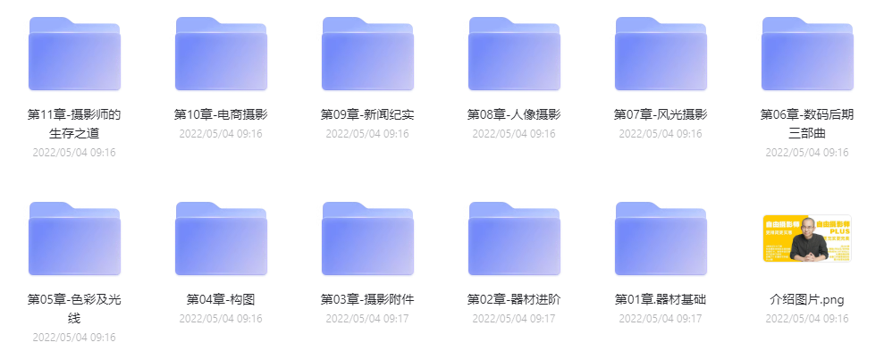 课程介绍:本套课程非常适用于自由摄影爱好者,摄影师学习研究。由国内知名摄影专家讲解,课程生动易懂,详尽有序,是国内近年来少有的摄影教程珍品!!自由职业摄影师教程—–《自由摄影师Plus》。这套教程由咔图摄影教育中心出品,在网易云课堂售价3298元。器材基础Plus、器材进阶Plus、摄影附件Plus、构图Plus、色彩及光线Plus、数码后期三部曲Plus、风光摄影Plus、人像摄影Plus、新闻纪实Plus、电商摄影Plus、摄影师的生存之道Plus。对于喜欢摄影的童鞋来说,这是一套非常不错的教程,值得观看。