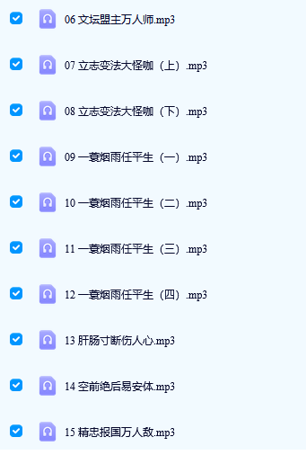 资源目录01 宋朝那些事儿.mp302 苦命帝王南唐造.mp303 今宵醉酒杨柳岸.mp304 为人耿直不屈一身正气哼!.mp305 宰相词人婉约风.mp306 文坛盟主万人师.mp307 立志变法大怪咖(上).mp308 立志变法大怪咖(下).mp309 一蓑烟雨任平生(一).mp310 一蓑烟雨任平生(二).mp311 一蓑烟雨任平生(三).mp312 一蓑烟雨任平生(四).mp313 肝肠寸断伤人心.mp314 空前绝后易安体.mp315 精忠报国万人敌.mp316 忠君爱国陆放翁.mp317 金戈铁马辛稼轩.mp318 波心荡冷月无声.mp3
