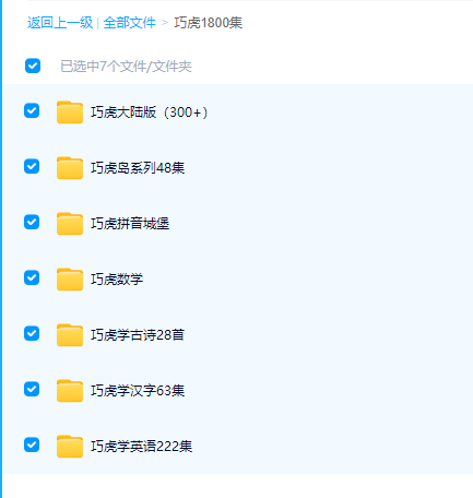 套资源共包含巧虎全系列共1800集,其中包括巧虎学英语222集,巧虎学古诗28首,巧虎学汉字63集,巧虎数学,巧虎拼音城堡,巧虎岛系列48集,巧虎大陆版300等,让你一次下个够!《巧虎开心成长》包括《认知学习系列》、《智益玩具系列》、《生活用品系列》。包括《巧虎的汉字百宝箱》、《巧虎开心泡泡英语》、《巧虎的数学欢乐城》、《巧虎的拼音城堡》、《巧虎的魔法积木世界》、《巧虎的智趣启蒙英语》、《巧虎快乐启蒙数学》、《和巧虎说说唱唱学语文》、《巧虎的创意百变屋》、《巧虎琪琪穿衣学习偶》、《巧虎的性格故事剧场》、《巧虎的影音图画书》《巧虎的数学欢乐城》、《巧虎的乐舞音乐盒》