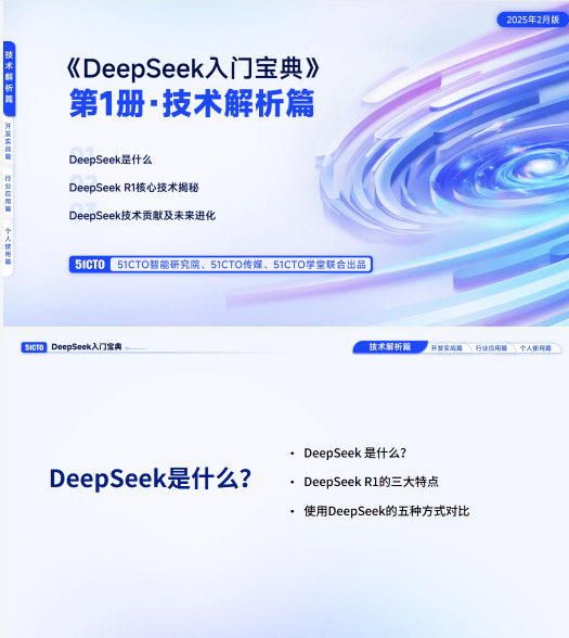 51CTO 智能研究院携手 51CTO 传媒、51CTO 学堂精心打磨出《DeepSeek 入门宝典》。这部宝典共四册,分别为《技术解析篇》《开发实战篇》《个人使用篇》《行业应用篇》,篇幅超 80 页,从技术剖析、实战开发、个人应用到行业落地等多层面,构建起通向 AI 世界的全面指南。文末会提供51CTO《DeepSeek 入门宝典》第1~4册pdf(全4册合集)免费下载地址,有需要的朋友不要错过哦。