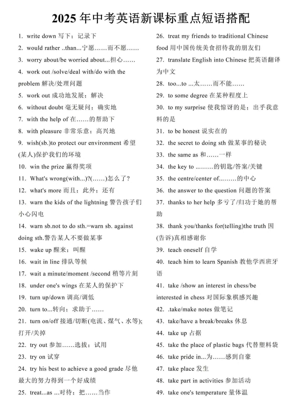 《2025中考英语新课标重点短语搭配》是一份为2025年中考英语复习整理的资料,汇总了425组重点短语搭配,涵盖各种常用表达,如“write down”(写下、记录下)、“would rather…than…”(宁愿……而不愿……)、“work out”(成功地发展、解决)等,帮助学生在考试中提高成绩。
